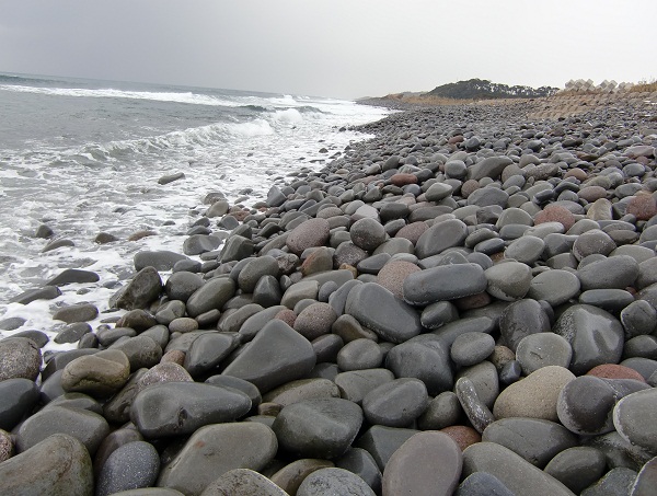 全国的にも珍しい大きな転石ばかりの塩津海岸。