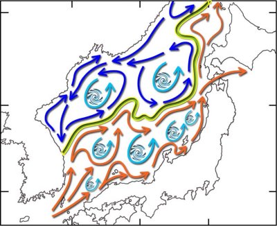 鳥取県の沿岸は赤色の矢印で示す黒潮由来の対馬暖流と、 空色の渦で示す水温・塩分がほぼ一定な山陰沖合の“固有冷水塊”の影響により、沿岸域表層付近の海水温は摂氏約10℃から28℃の範囲で季節により著しく変化し、プランクトンや小魚などの餌が非常に豊富なため、多種多様な魚介類の生息を周年可能にしている、非常に恵まれた海域です。